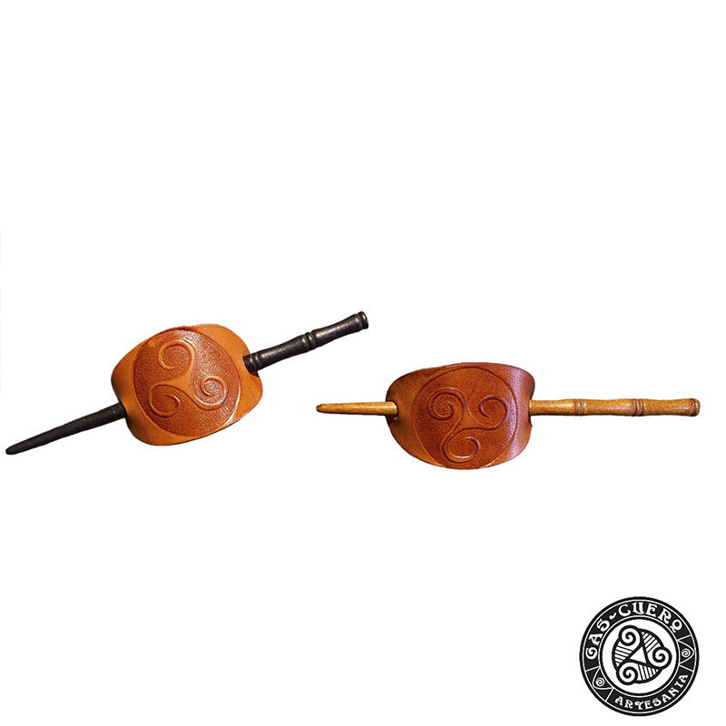 Este hermoso pasador de pelo está diseñado con un elegante troquel del símbolo triskel celta, que representa el equilibrio y la continuidad. Hecho de cuero de alta calidad, no solo es un accesorio atractivo, sino también duradero. El pasador cuenta con un toque especial: un pasador de madera que añade un contraste natural y cálido al diseño.